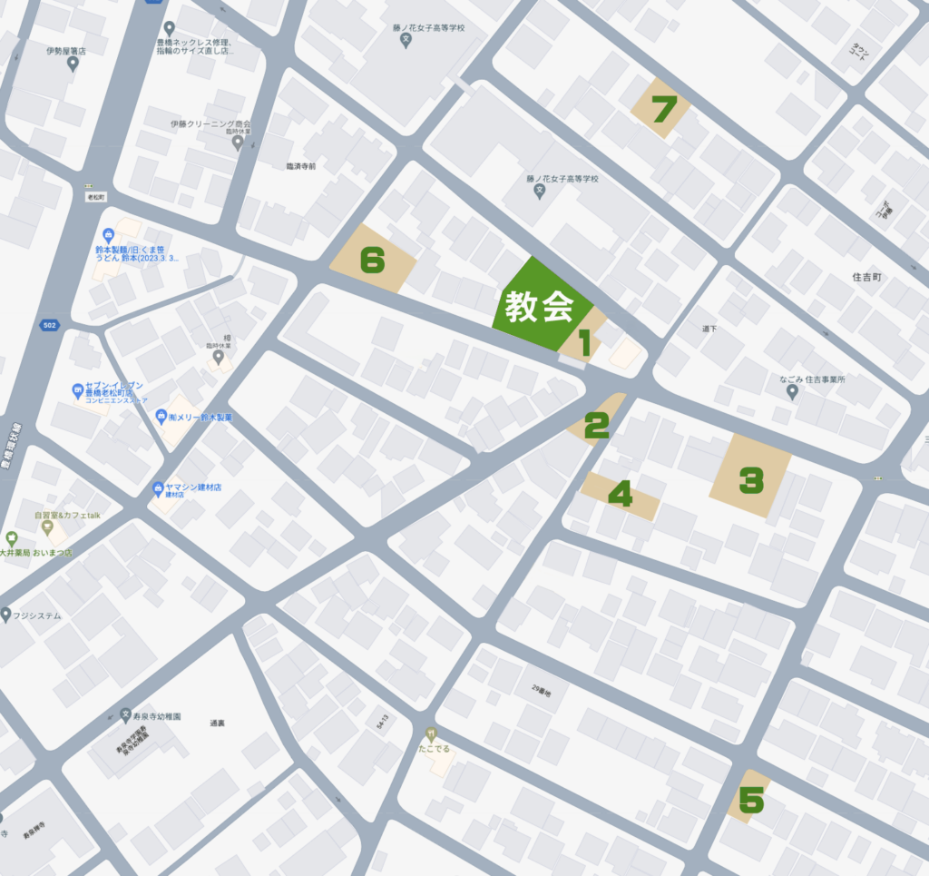 住吉チャペル ●住所 〒440-0052 愛知県豊橋市住吉町160-1 ●車でお越しの方1番〜7番の駐車場をご利用ください。※4番は軽自動車専用の駐車場です※6番・7番は日曜日のみ利用可能です ●公共交通機関でお越しの方JR豊橋駅から豊橋鉄道市内線(市電)に乗車、東田坂上駅より徒歩7分